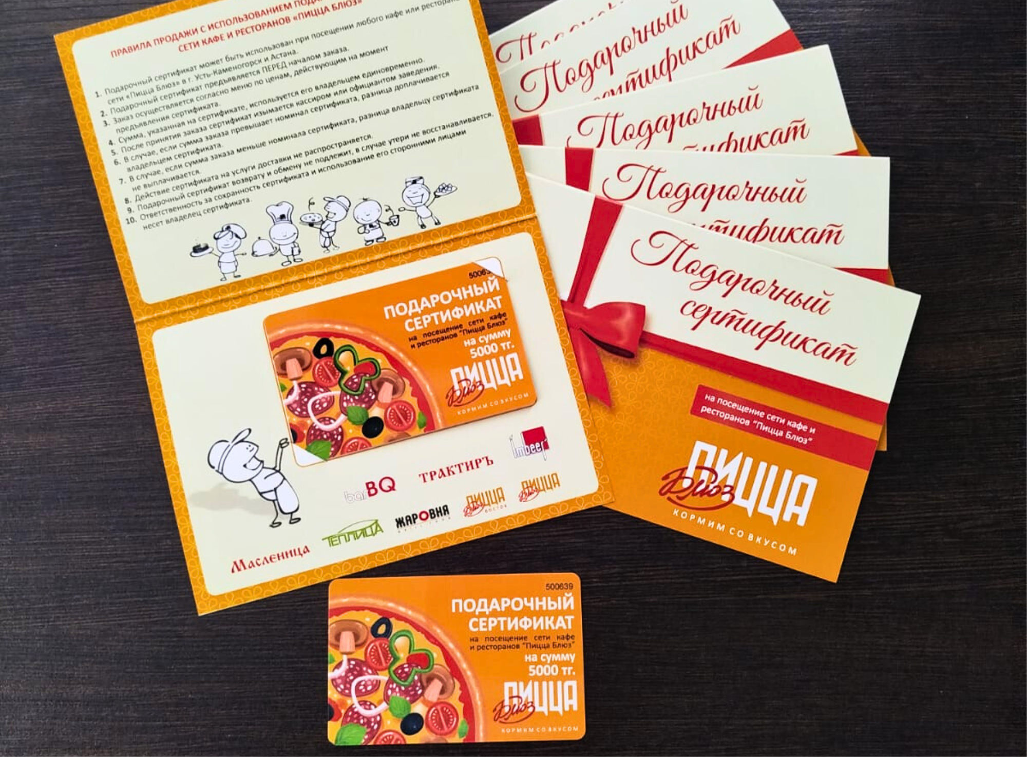 Компания «Пицца Блюз» предлагает Вам ПОДАРОЧНЫЕ СЕРТИФИКАТЫ номиналом в 3 000 тг и 5 000 тг, которые можно приобрести на кассе любого кафе или ресторана нашей сети. Виновник торжества сможет предъявить их в качестве оплаты в любом заведении сети "Пицца Блюз" на свой выбор.