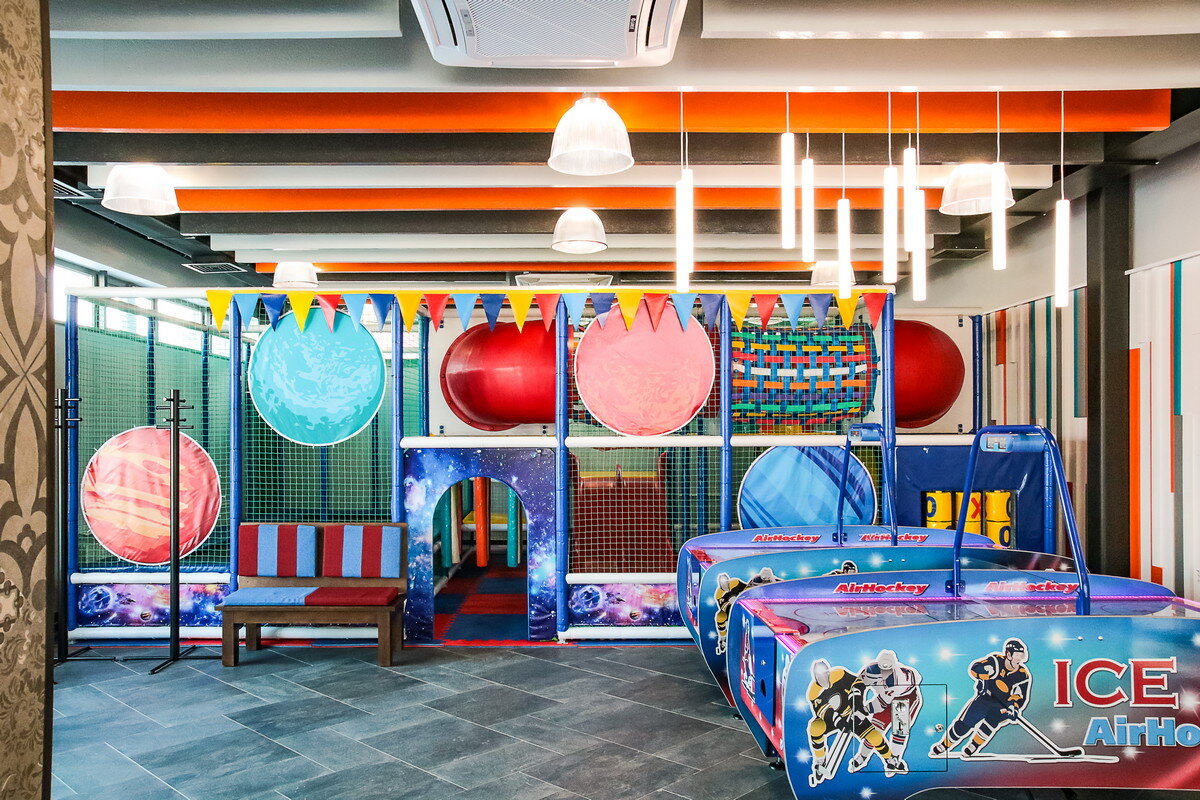 Для комфорта малышей, игровые зоны также разделены в зависимости от роста: до 100 см (комната для малышей на первом этаже кафе) / от 100 до 120 см (игровая на втором этаже кафе). Для детей постарше мы также предлагаем поиграть в аэрохоккей.