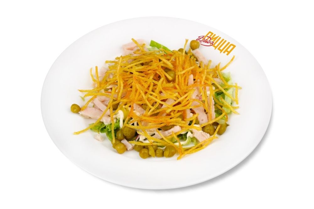 курица копченая, огурцы маринованные, горошек, картофель пай, красный лук, лист салата, майонез