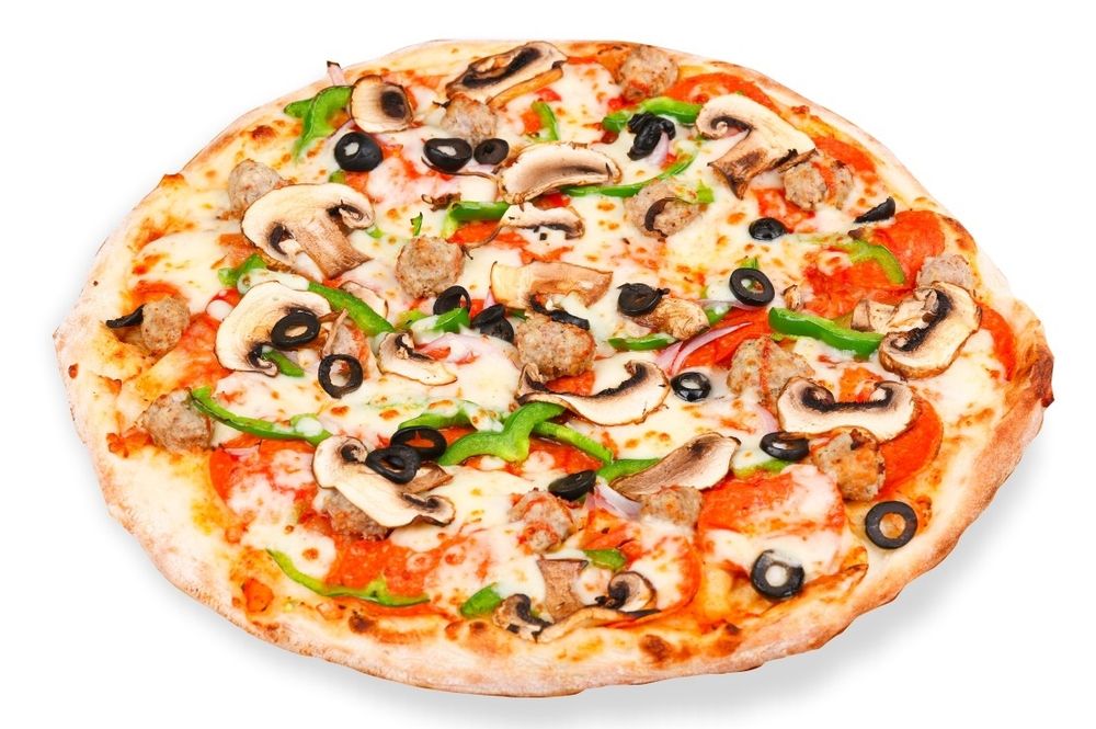 пепперони, митболы, шампиньоны, болгарский перец, маслины, красный лук ,кетчуп, моцарелла