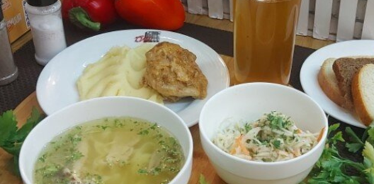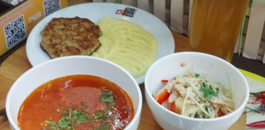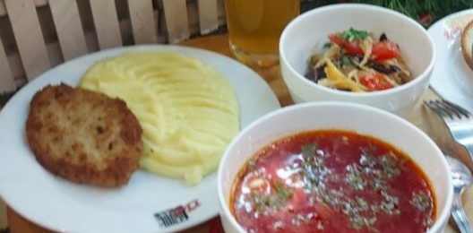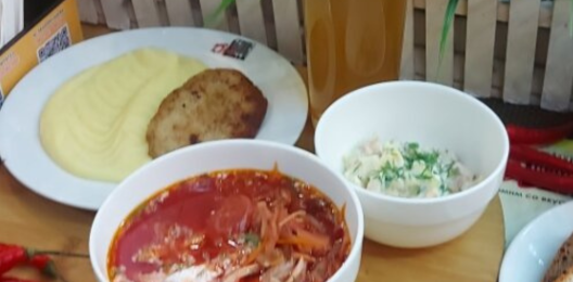 Салат "Свекольный; Суп с фрикадельками; Перец фаршированный с овощным соусом; Гарнир на выбор; Компот; Хлеб