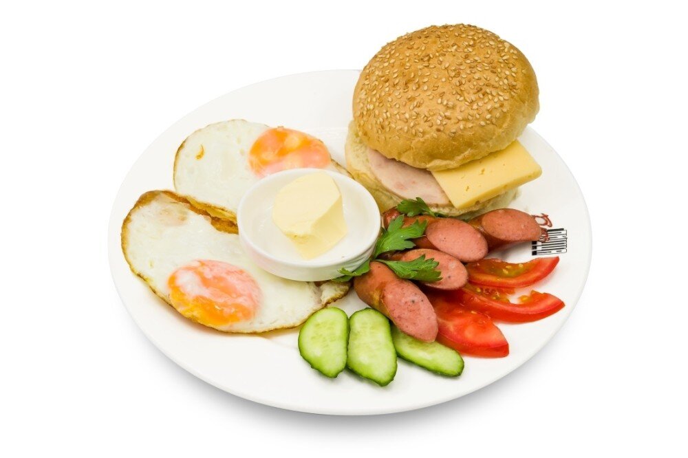 Яичница, колбаска "Охотничья", булочка, ветчина, огурцы, помидоры, масло, чашка чая/кофе на выбор