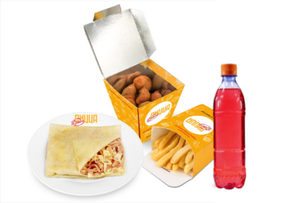 Чебуречки, блин Гурьевский на выбор, картофель фри, компот 0,5 л