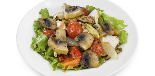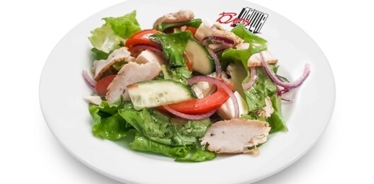 Помидоры, огурцы, рваная говядина, лук, брынза, маслины, лист салата, лимонно-масляная заправка