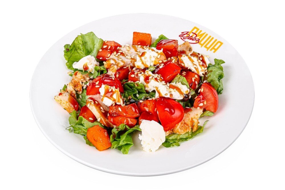 запеченная тыква, филе цыпленка, сливочный сыр, помидоры, лист салата, масло, соус терияки, кунжут