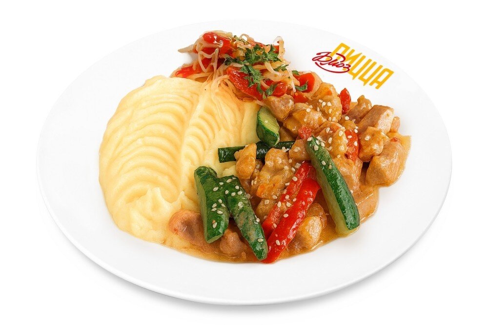 Куриная мякоть, болгарский перец, огурец, сметана, соус терияки, чеснок, кунжут, подгарнировка по-сезону, гарнир