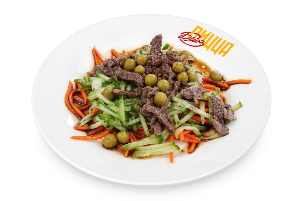говядина, огурцы, морковь, зеленый горошек, лук, соевая заправка