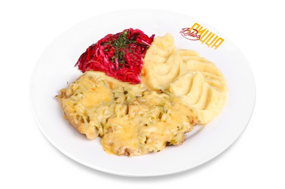 бедро цыпленка, маринованные огурцы, сыр, подгарнировка по-сезону, гарнир