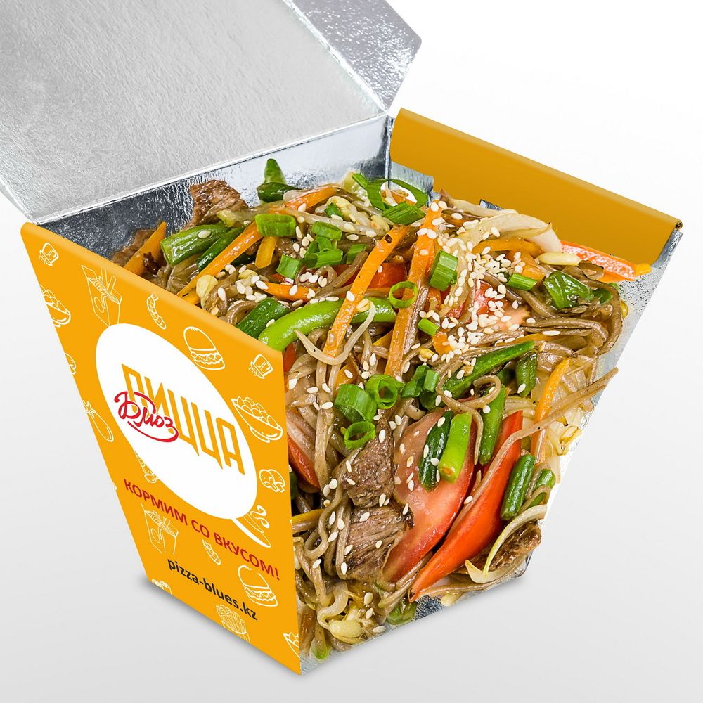 Говядина, лапша, удон, лук, морковь, помидоры, ростки сои, фасоль стручк., соус устрич., кунжут, зел. лук