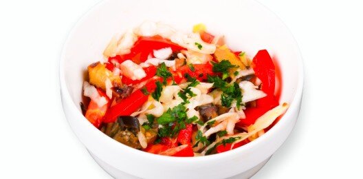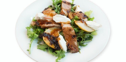 Курица жарен., помидоры, огурцы, лук мар., брынза, лист салата, маслины, лимонно-масл.заправка