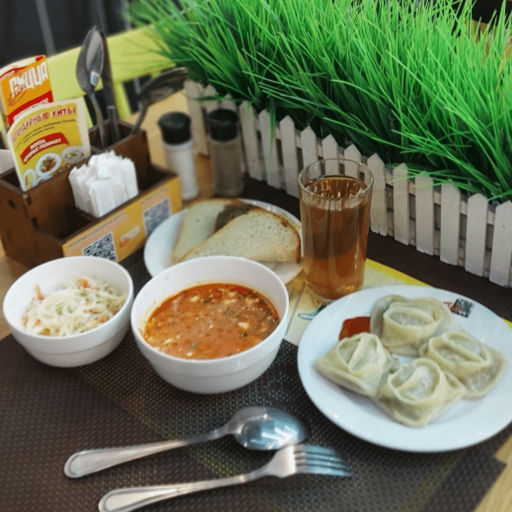 Салат "Коул слоу", Суп "Свекольник", Манты курино-говяжьи (с кетчупом и майонезом), Компот, Хлеб