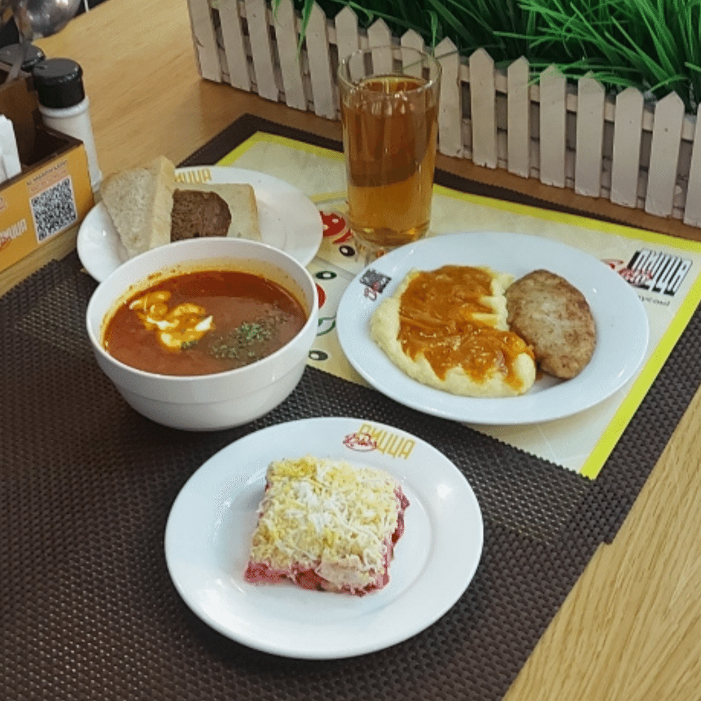 Салат "Нежность", Солянка по-домашнему, Котлета "Нежность", Гарнир на выбор, Компот, Хлеб