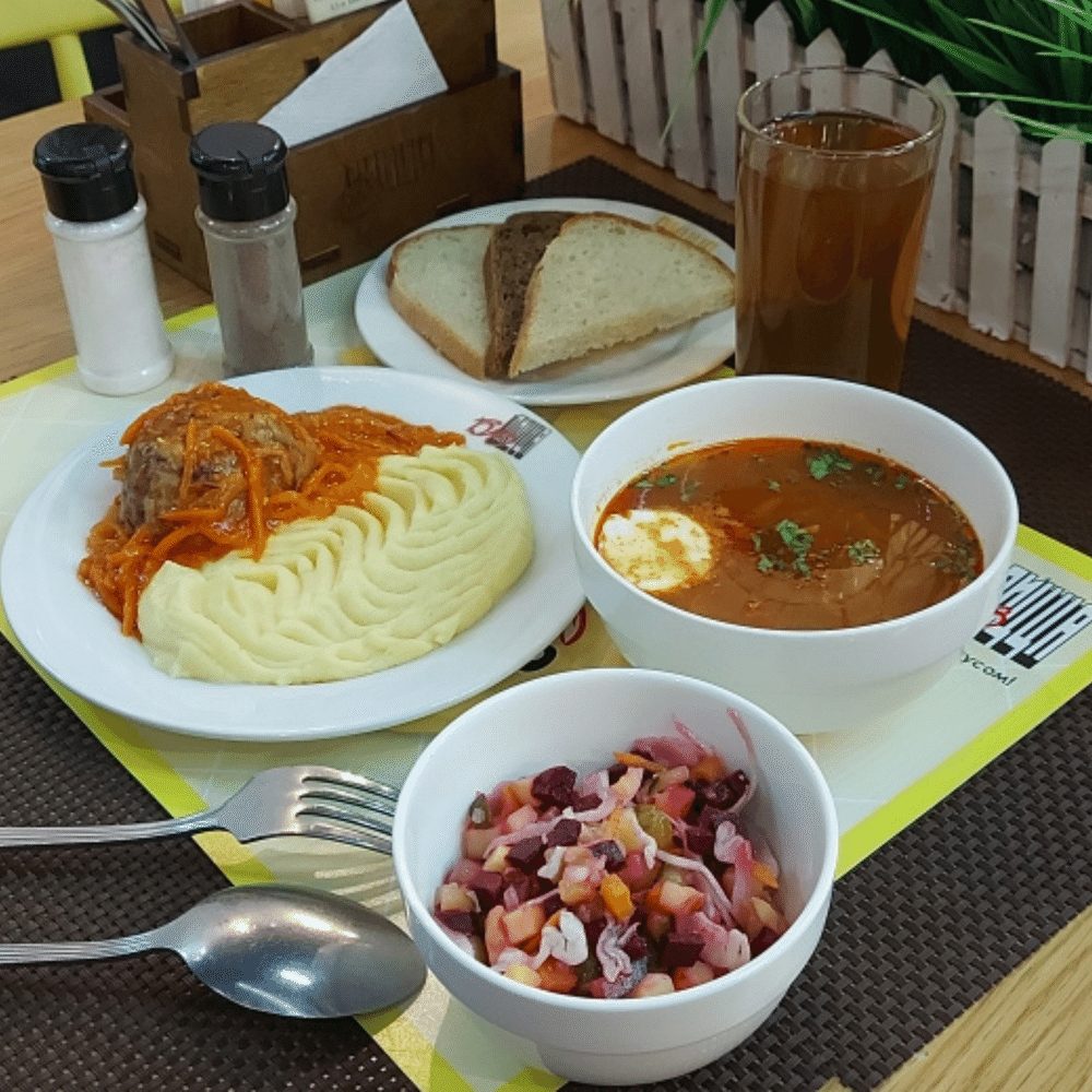 Винегрет; Рассольник; Тефтели по-домашнему с соусом; Гарнир на выбор; Компот; Хлеб