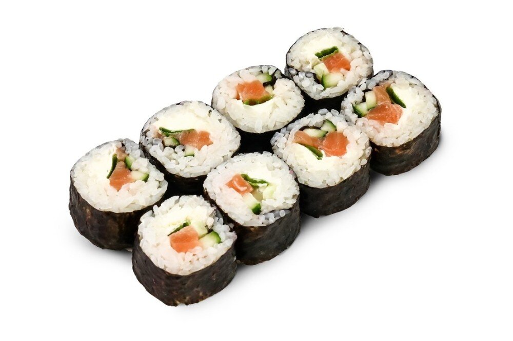 семга, огурцы, сливвочный сыр, зеленый лук, рис, листья нори (8 шт)