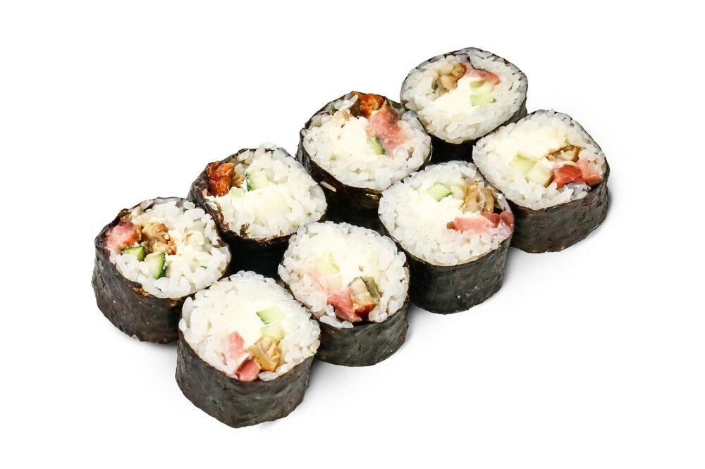 угорь, горбуша, огурцы, сливочный сыр, рис, листья нори (8 шт)