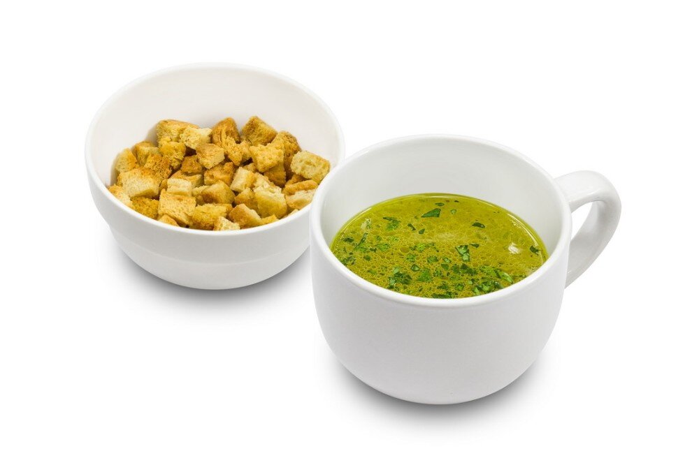 Куриный бульон, зелень, сухарики