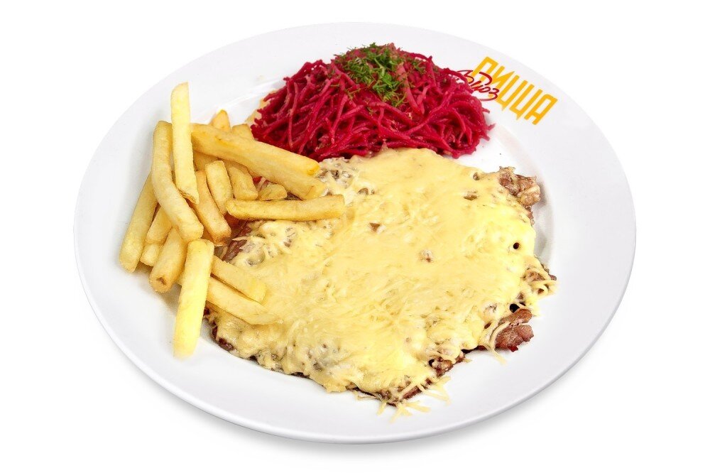 Свинина, грибы, лук, сметана, сыр, подгарнировка по сезону, гарнир