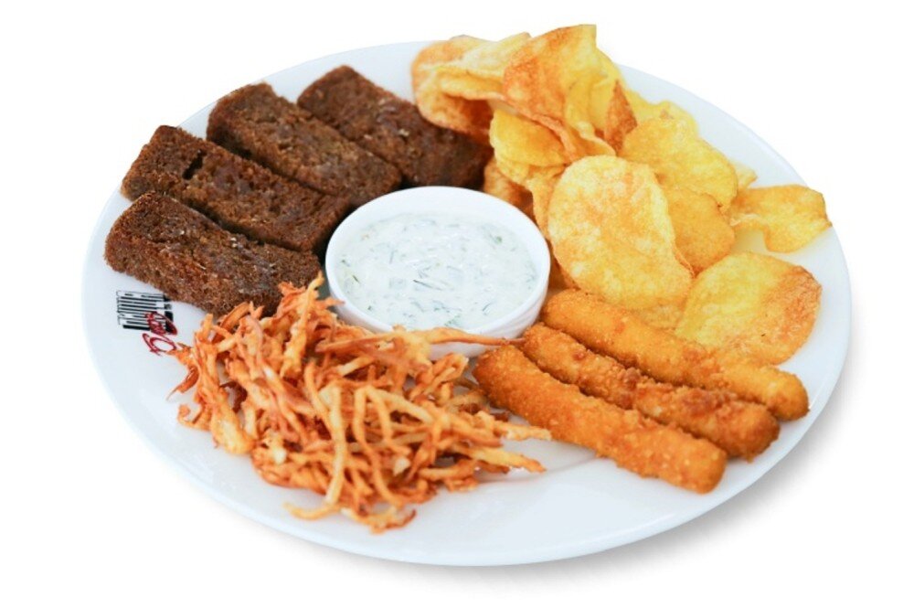 кальмары темпура, рыбные палочки, сырные палочки, домашние чипсы, гренки с чесноком, орешки в специях, соус сальса
