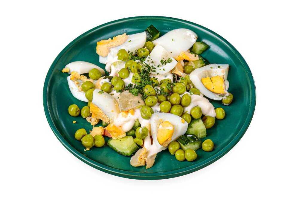 Красная рыба, огурцы, зеленый горошек, яйцо, майонез