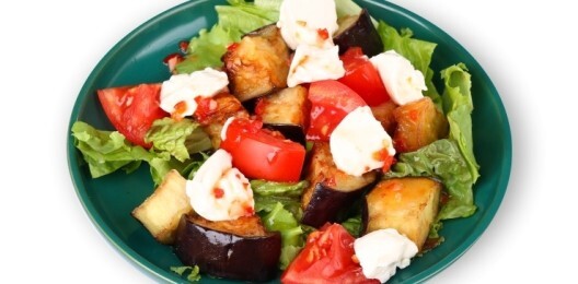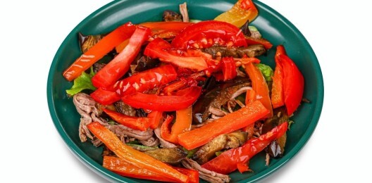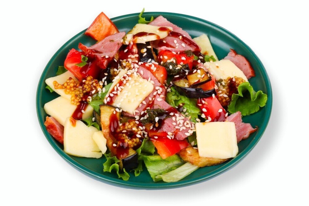 Говядина, баклажаны, помидоры, перец болгарский, сыр, соус терияки, горчица зернистая, чеснок, кунжут, масляная заправка