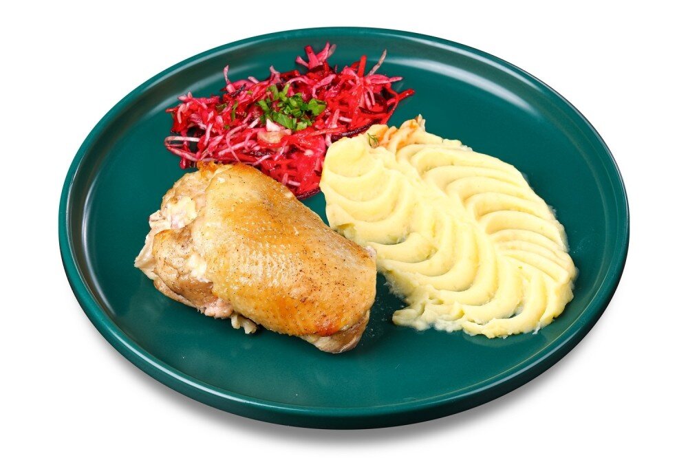 Куриная отбивная, ветчина, грибы, сыр, подгарнировка по сезону, гарнир