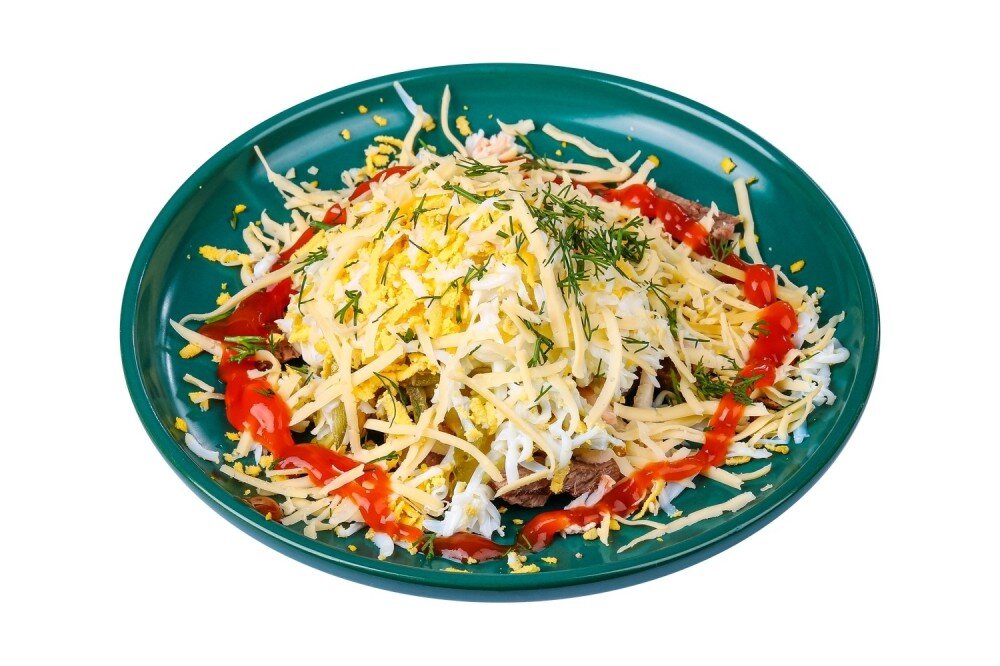 Говядина, курица, огурцы марин., яйцо, сыр, чеснок, кетчуп, майонез