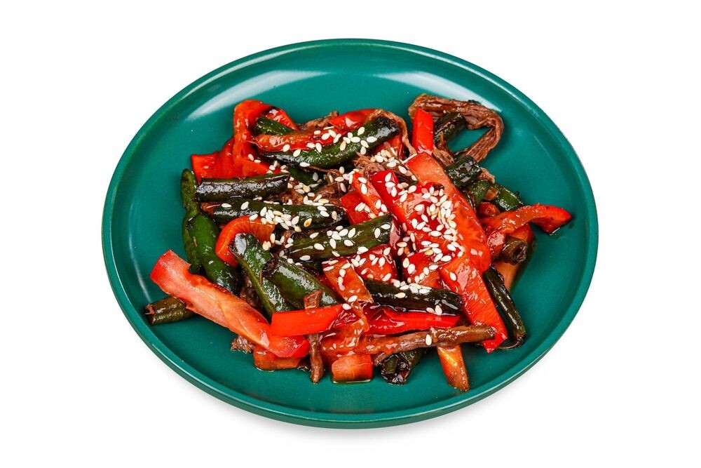 рваная говядина, стручковая фасоль, запеченный болгарский перец, помидоры, соус терияки, кунжут