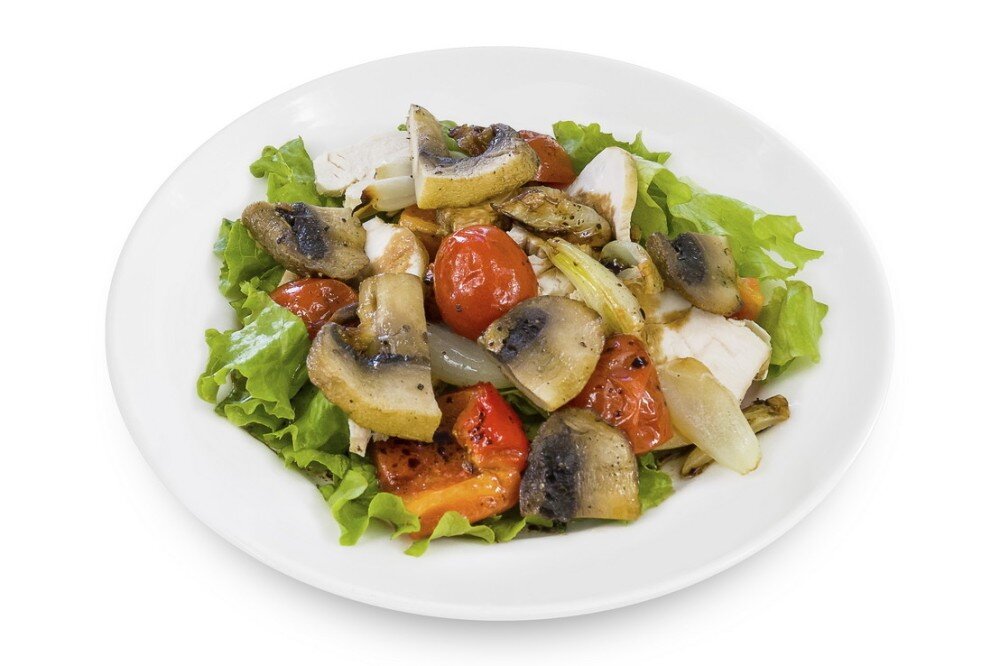 Куриное филе гриль, перец гриль, помидоры гриль, лук гриль, шампиньоны гриль, заправка соевая