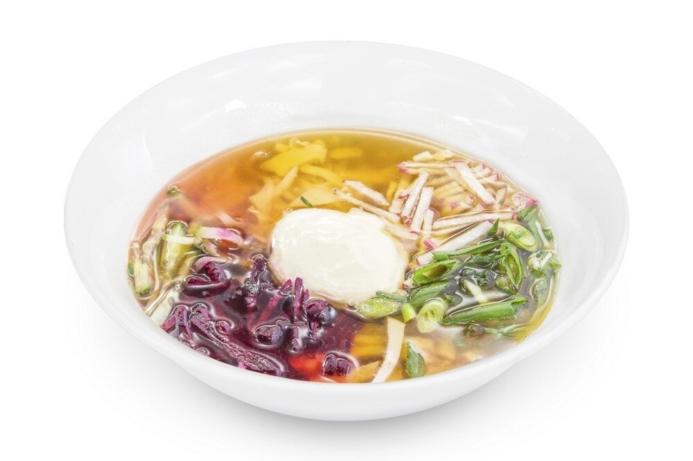 Курица копченая, свекла, огурец, редис, яйцо, сметана, квас, хрен, горчица
