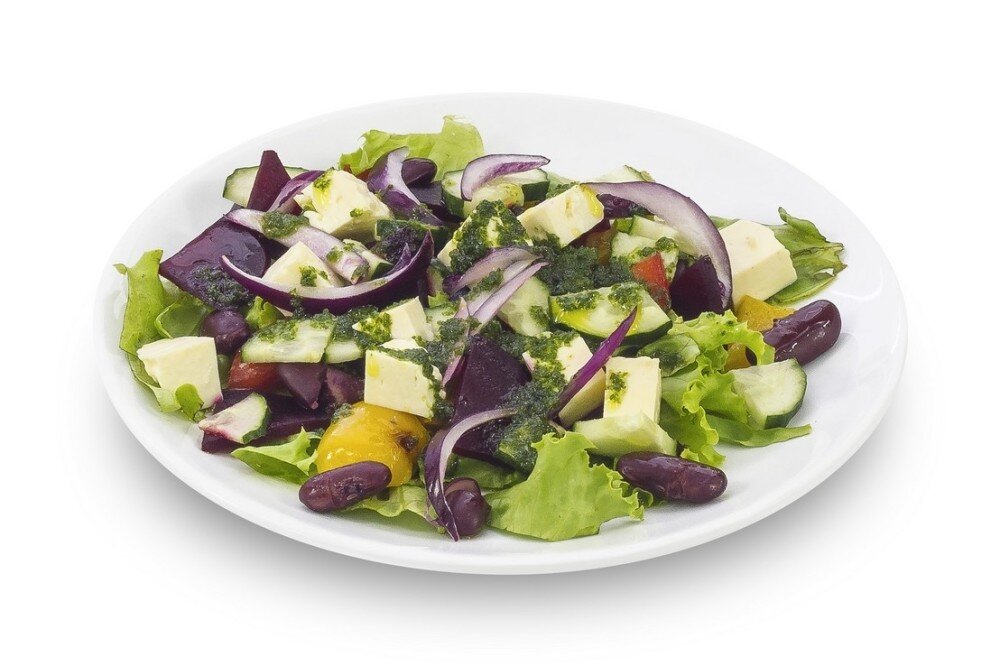 Свекла, перец болгарский гриль, фасоль, брынза, огурец, лук красный, лист салата, соус песто