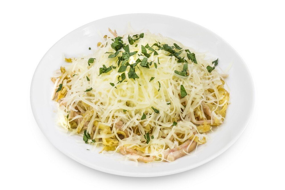 Яичный блинчик, ветчина, грибы маринованные, филе куриное на гриле, сыр, майонез, зелень