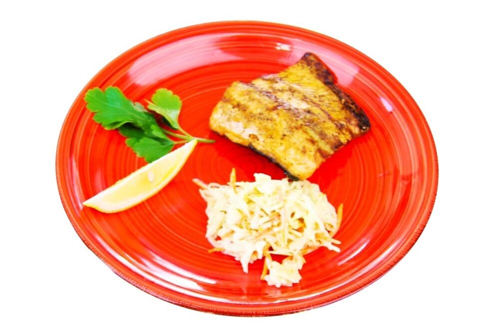 в лимонном соусе и специях, подгарнировка "коул слоу", лимон
