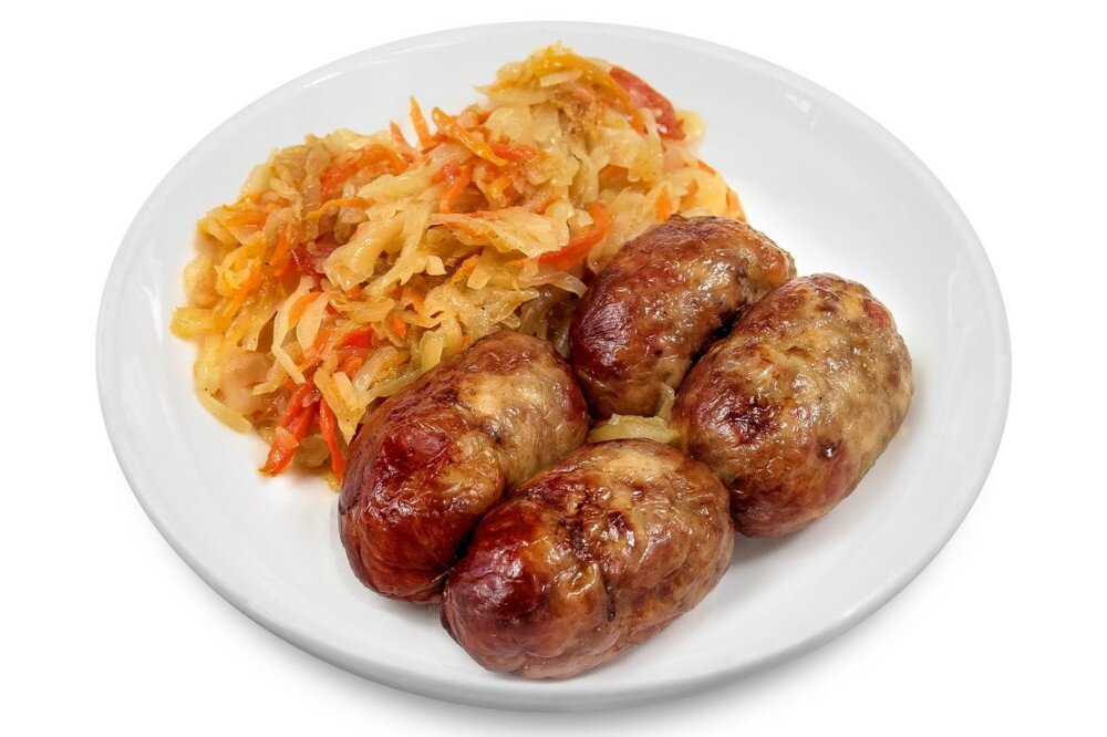 Фарш курино-гов., колбаса "Охотничья", сыр, лук. Гарнир не входит в стоимость блюда.