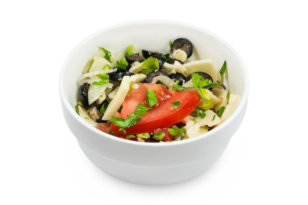 Помидоры, маслины, лук марин., сыр сулугуни, грец.орех, кинза, масло, чеснок, мед