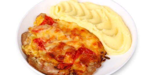 Фарш курино-говяжий, лук, морковь, сыр, майонез. Гарнир не входит в стоимость блюда