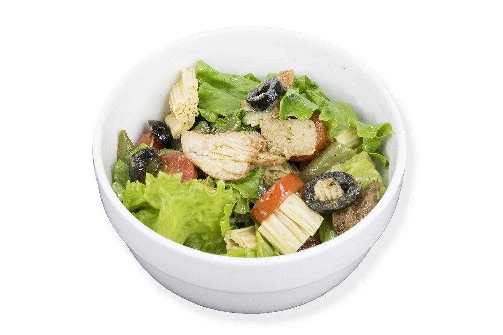 Индейка, спаржа, фасоль стручковая, помидоры, маслины, лист салата, лимонно-масляная заправка