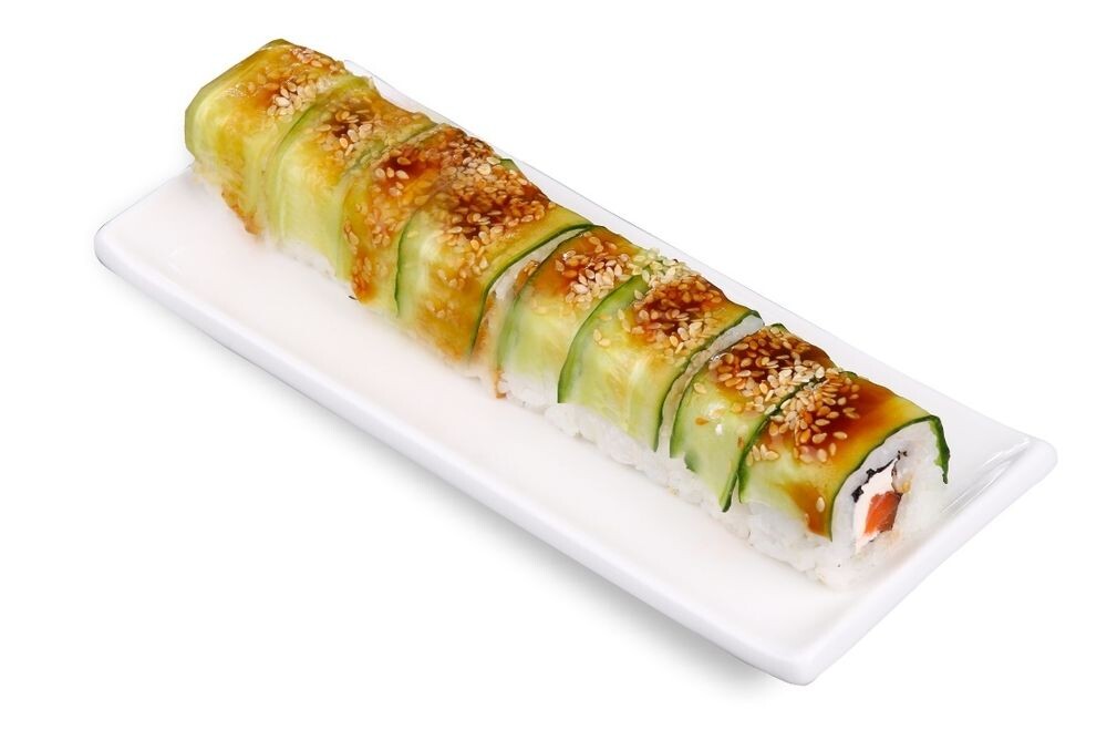 Семга, огурцы, сыр сливочный, соус унаги, кунжут, рис, листья нори