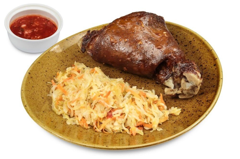 Свиная рулька в соевом маринаде, запеченная с горчицей. Подается с острым соусом красным и тушеной капустой