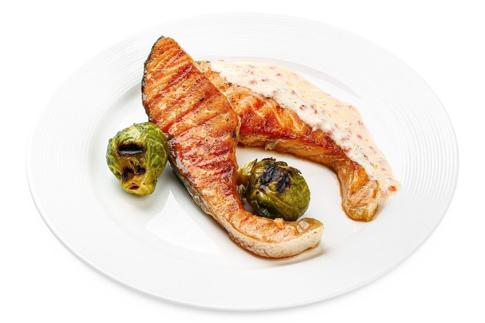 Жареная семужка с чесноком под соусом сметанным, красной икрой на решетке из теста, украшается капусткой брюссельской