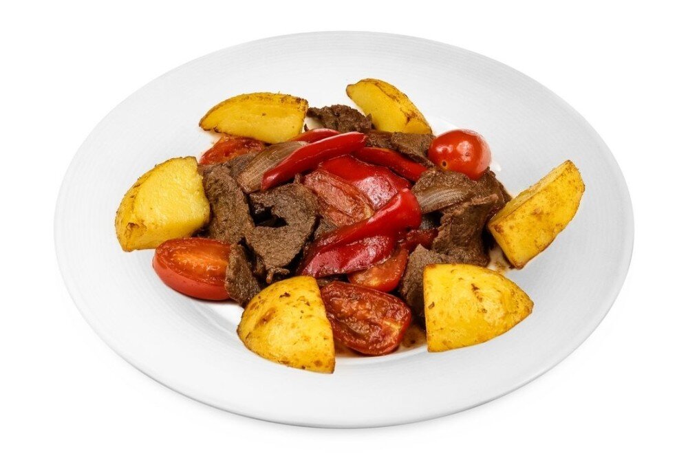 Кусочки говядины, маринованные в соевом соусе и обжаренные с перчиком болгарским, лучком и помидорками, подается с жареной картошечкой