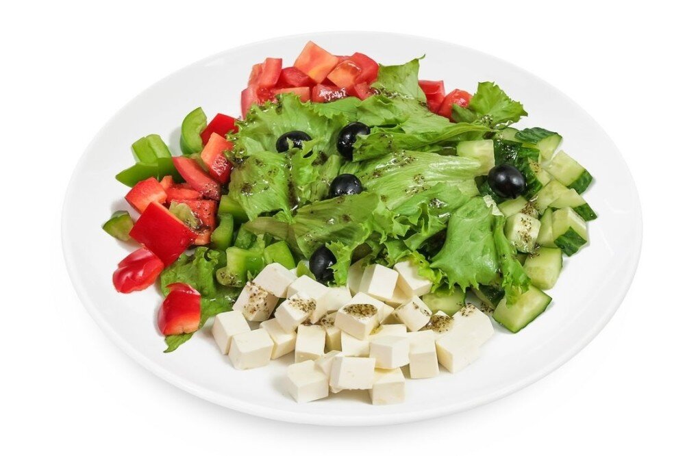 свежие овощи с сыром фета, оливковым маслом, орегано и базиликом