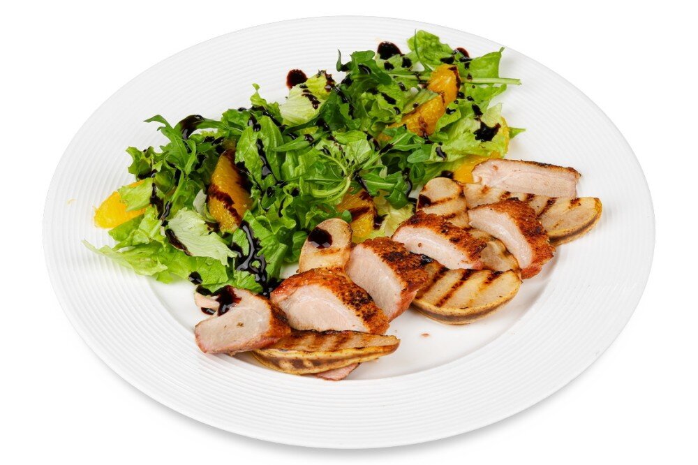 Утиное филе с грушей на гриле, лист салата, руккола, мякоть апельсина, крем бальзамико