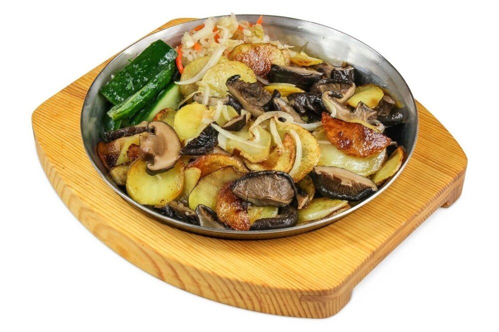 В порционной сковородочке. Жареная картошка с грибочками, лучком золотистым, капустой квашеной и огурчиком малосольным