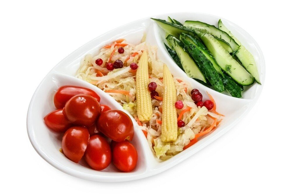 Малосольные огурчики, капуста квашеная с клюквой, маринованные помидоры
