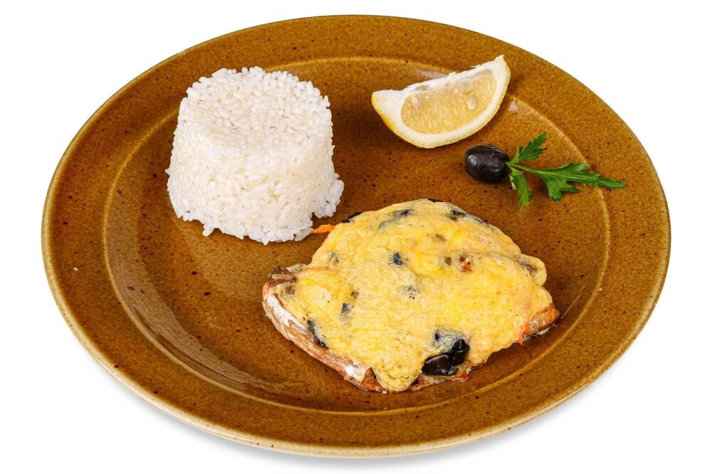 запеченная под сыром с луком да морковочкой, помидорками и баклажанами, подается с рисом