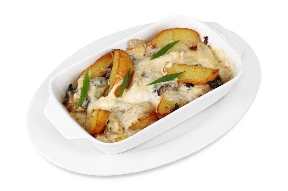 картофель, сливочный соус, лук, чеснок, сыр