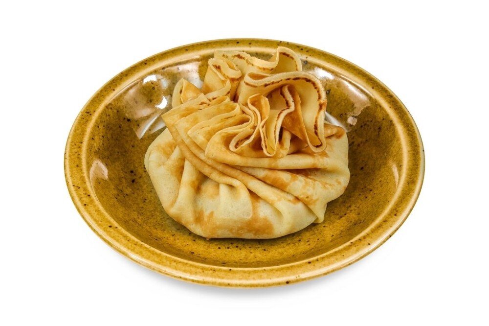 Салат в блинном мешочке. Нежное сочетание отварного языка, копченой говядины и курочки копченой с огурчиками маринованными с майонезом
