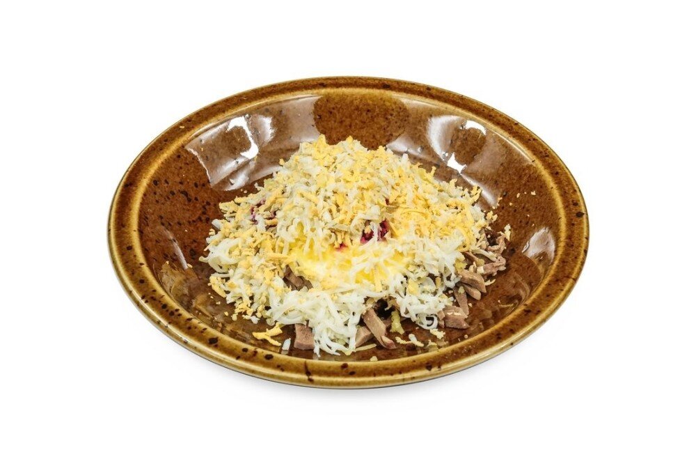 Кусочки говядинки и языка телячьего с картофелем, свеклой и грибочками под майонезом и яичком тертым