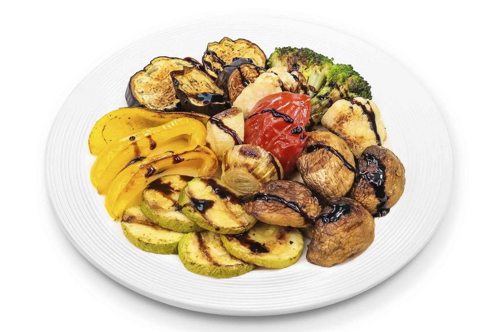 брокколи, цветная капуста, перец болгарский, помидоры, лук, шампиньоны, гриль, цукини, баклажаны, крем бальзамико