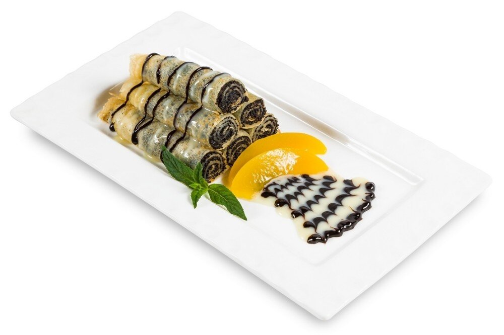 С маком, шоколадным соусом, сгущенным молоком и персиком